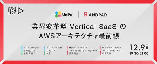 こんにちは!アンドパッドEMの土方です。 2021/12/09(木) 19:30-21:00、ユニファ株式会社様との共催イベントを開催いたします! andpad.connpass.com 本イベントはユニファ株式会社様との二回目の共催イベントとなっております。 今回は業界変革型 Vertical …