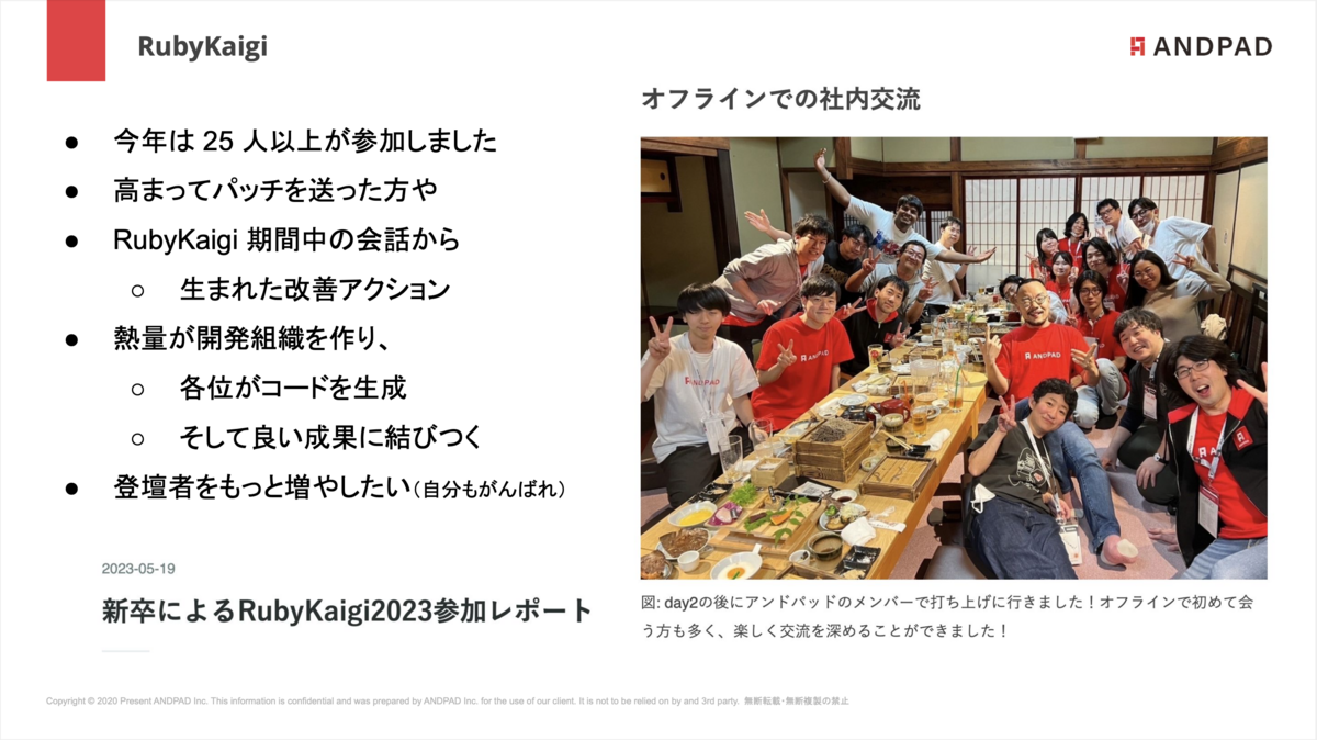 また、今年は RubyKaigi 2023 にアンドパッドから 20 名を超える参加者となり、コミュニティとともにサービスを展開し、プロダクトを開発するということの熱量を多くのエンジニアが高めることができました。私事となりますが、Ruby コミッタである @hsbt もアンドパッドのプロダクト開発に間接的に関わることとして、Ruby の最前線の状況を社内で共有や、セキュリティの事案などを始めとする非機能要件のベースラインの底上げについて取り組んでいます。このようにプロダクトに OSS を利用するだけではなく、OSS のコミュニティの一員としての取り組みを継続的に進めていきます。