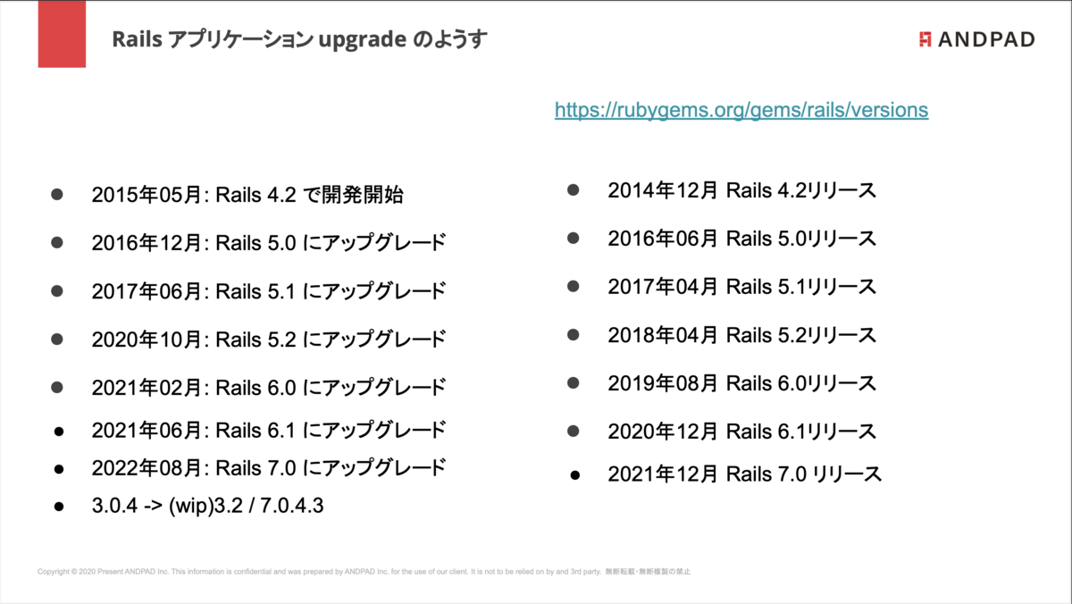 そのような取り組みの結果、アンドパッドの中で一番大きく歴史がある Rails アプリケーションも Ruby 3.0 かつ Rails 7.0 と最新に近い状況をキープできています。現在は Ruby 3.2 や Shopify が開発した YJIT の有効化なども進めており、開発者の開発者体験を向上させるとともに、ユーザーにとってもパフォーマンスが良いアプリケーションの提供に向けて取り組んでいる真っ最中です。