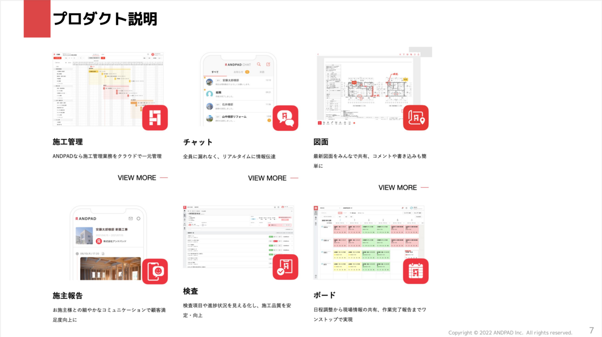 アンドパッドは、建設業界向け SaaS として以下2枚のスライドのように様々なプロダクトを展開しています。